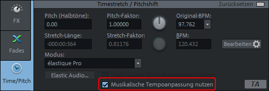 Um die musikalische Tempoanpassung zu nutzen, aktivieren Sie in der Ansicht Time/Pitch im Objekteditor der Audioobjekte die Option Musikalische Tempoanpassung nutzen.
