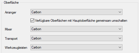In diesem Dialog können Sie zwischen verschiedenen Oberflächen für den Arranger, die Werkzeugleisten, den Mixer und die Transportkonsole wählen. Durch Laden einer anderen Oberfläche können Sie die farbliche und grafische Gestaltung der Samplitude-Programmoberfläche verändern.