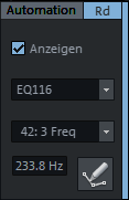 Wählen Sie im unteren Abschnitt des Menüs Beide Ausklappmenüs öffnen das Automationsmenü, bei der Automation von Effektparametern wird im oberen Menü der Effekt und im unteren der Parameter angezeigt. Wechseln Sie nun mit der Schaltfläche unten in den Mausmodus Automations-Zeichenmodus und zeichnen die Parameteränderungen direkt mit dem Stift in das Objekt ein. Zum Umschalten zwischen der Anzeige von Spur- und Objektautomationen können Sie auch das Kontrollkästchen Anzeigenoben im Abschnitt Automation benutzen. |