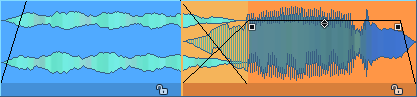 Auch wird automatisch ein Crossfade erzeugt, sobald ein Objekt über ein anderes Objekt geschoben wird. Dabei geht ein eventuell vorhandenes Fade-Out am vorderen Objekte verloren. Hat das hintere Objekt ein Fade-in, entsteht, je nach Dauer der Überlappung, ein Crossfade kürzer oder gleich der Länge dieses Fade-ins, ohne Fade-in wird der Standard-Crossfade angewandt.