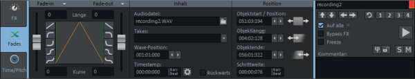 Der Objekteditor ist in drei Bereiche aufgeteilt: FX, Fades und Time/Pitch. Zum Bearbeiten von Objekten kann der Objekteditor stets geöffnet bleiben, seine Anzeige passt sich immer dem ausgewählten Objekt an, bei einer Mehrfachauswahl ist das das Objekt, das zuletzt der Auswahl hinzu gefügt wurde.