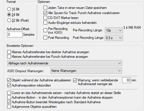 Pre-Recording (nur ASIO und Wave Format): Wenn aktiv, fügen Sie mit dieser Funktion Audiomaterial, das vor dem Start der Aufnahme am Eingang anlag, zum Anfang der aktuellen Aufnahme hinzu, wenn Sie aus dem Stopp-Zustand oder aus der Wiedergabe heraus die Aufnahme aktivieren. Voreingestellt sind 5 Sekunden, es sind aber bis zu 120 Sekunden möglich. Verschieben Sie den Objektstart der aufgenommenen Objekte nach links, um dieses Material sichtbar zu machen.