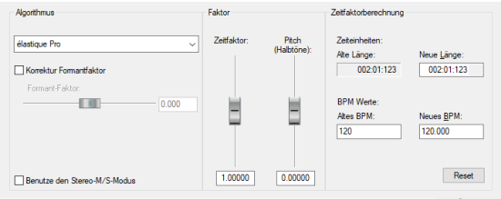 Mit den Parametern Zeitfaktor und Pitch (Halbtöne) werden Tonhöhe und Tempoveränderungen festgelegt.