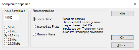Mit dieser Funktion können Sie die Samplerate (Abtastrate) einer Audiodatei verändern. Dieser Vorgang wird auch als „Resampling“ bezeichnet