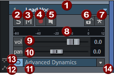 Spurnummer und -name: Durch Anklicken des Spurnamens oder der Spurnummer wählen Sie die Spur aus. Wiederholtes Klicken auf die Spurnummer bewirkt, dass die Darstellungshöhe der Spur zwischen flach und hoch hin- und hergeschaltet wird. Durch Doppelklick können Sie den Spurnamen bearbeiten. Durch Rechtsklick auf den Spurnamen öffnen Sie den „Spureinstellungen“-Dialog. Mit Klick auf den Pfeil können Sie weitere spurbezogene Funktionen aus einem Kontextmenü wählen. |