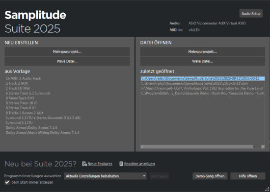 Die Startauswahl öffnet sich bei jedem Start von Samplitude, lässt sich aber auch aus dem Menü Hilfe heraus öffnen. Sie bietet verschiedene schnelle Optionen für das Arbeiten mit Samplitude an.