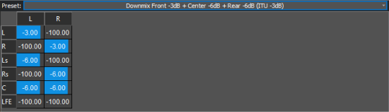 In der Preset-Liste oben gibt es Voreinstellungen für Downmixes von 5.1 in Stereo. Sie können auch eigene Koeffizienten als Preset abspeichern. Der Downmix wird beim Stereo-Master-Export eines Projekts berücksichtigt.