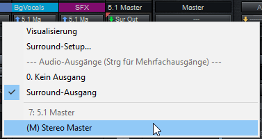 Öffnen Sie dazu im Mixer am entsprechenden Surround-Master das Ausgangs-Menü und wählen Sie den zusätzlichen Master mit gehaltener Strg-Taste aus.