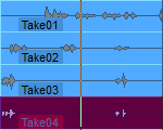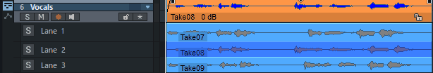 Mit den Take Lanes lassen sich für die Objekte einer ausgewählten Spur der einzelnen Aufnahmedurchgänge (Takes) untereinander darstellen. Sie können so die besten Teile der einzelnen Takes eines Objekts zur perfekten Aufnahme kombinieren. Diese Funktion wird auch „Comping“ genannt.