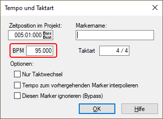 Der Rasterpositionsmarker wird gesetzt, ohne dass der Dialog Tempo und Taktart geöffnet wird. Die Option Tempo zum vorhergehenden Marker interpolieren in dem Dialog ist voreingestellt aktiviert, da davon ausgegangen wird, mit der Eingabe von Rasterpositionsmarkern kontinuierliche Temposchwankungen zu erfassen.