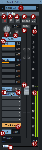 Im Track Editor werden die Einstellungen einer Spur übersichtlich in einzeln aufklappbaren Sektionen dargestellt. So können Sie auch ohne geöffneten Mixer oder bei geringen Spurhöhen im Projektfenster alle relevanten Einstellungen der ausgewählten Spur bearbeiten. Die Bedienelemente entsprechen denen in einem Mixerkanal, Sie können sich den Track Editor also auch als einzelnen Mixerkanal für die aktive Spur denken.