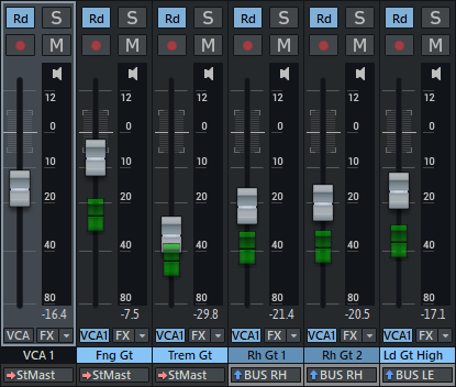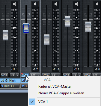 Sie können die VCA-Gruppierung also auch so vornehmen, indem Sie eine neue Spur erstellen, dort die Option Fader ist VCA-Master aktivieren und dann in den Spuren, die gesteuert werden sollen, diese VCA-Gruppe auswählen. Als Gruppenname wird im Menü und auf den Schaltflächen für die VCA-Steuerung der Spurname benutzt.