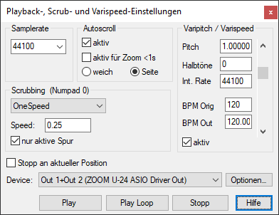 Dieser Dialog bietet neben der Varispeed-Funktion auch Zugriff auf wichtige andere Wiedergabeeinstellungen wie Scrub-Control, Autoscroll oder das Standard-Ausgabegerät.