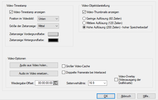 • Video-Objektdarstellung: Mit der Option Video Thumbnails anzeigen können Sie in der Videospur Thumbnails in unterschiedlicher Auflösung anzeigen lassen. Im Zeichenmodus 2 der Darstellungsoptionen (Tabulator-Taste) werden nur der erste und der letzte Frame angezeigt.