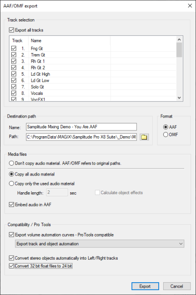 Note: During AAF/OMF export, media files will always be converted to WAV files. You can't export video files. Corresponding objects are not transferred as well.