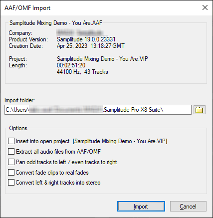 Extract all audio files from the AAF/OMF: If the media data is embedded in the AAF/OMF file, it will be extracted during import and saved as wave files in the project folder.