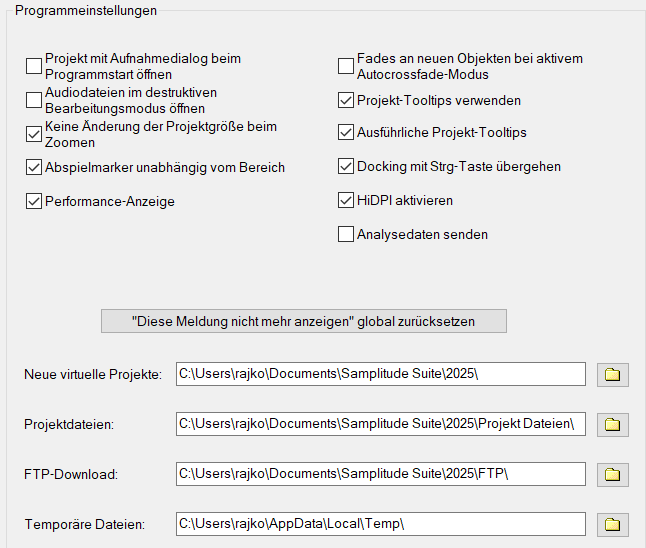 Neue virtuelle Projekte: Unter dem hier ausgewählten Pfad werden alle neuen virtuellen Projekte sowie die aufgenommenen und beim Import erzeugten Audiodateien abgespeichert.