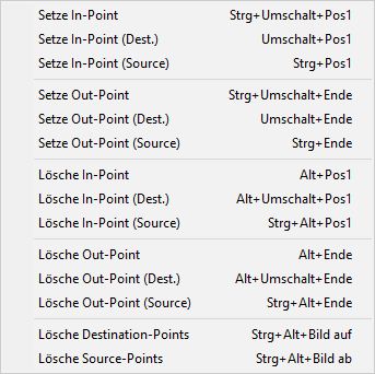 Die Tastaturkürzel für diese Befehle sind logisch aufgebaut: Pos1/Ende bestimmt In/Out, + Strg für die Source-Points, + Umschalt für die Destination-Points, + Alt zum Löschen der jeweiligen Punkte. Die unspezifischen Tastaturkürzel setzen sich aus Pos1/Ende für In/Out zusammen, mit Strg + Umschalt zum Setzen und Alt zum Löschen der Punkte.