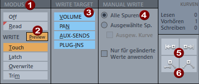 PREVIEW: Aktiviert den Modus Automation vorhören bei dem Parameter geändert werden können, aber keine Aufzeichnung erfolgt. Benutzen Sie diesen Modus auch zum manuellen Schreiben von Automationswerten. |