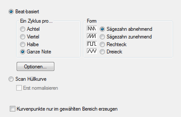 Mit der Option Beat-basiert richtet sich die Gestalt der Automationskurve nach dem Beat des Arrangements. Unter Form können Sie zwischen 4 verschiedene Basisformen für die Automationskurve zur Verfügung: 2 Sägezahnformen, Rechteck- und Dreieckform. Mit Ein Zyklus pro… können Sie festlegen, ob diese Wellenform einmal pro Achtel-, Viertel-, Halber- oder Ganzer Note durchlaufen werden soll.