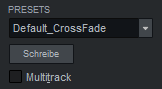 Um die aktuellen Einstellungen im Crossfade-Editor als Crossfade Preset abzuspeichern, klicken Sie auf die Schreiben-Schaltfläche und vergeben Sie einen neuen Namen. Das abgespeicherte Preset erscheint von nun an in der Presets-Liste.