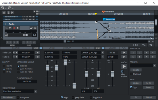 Mit dem Crossfade-Editor steht Ihnen ein mächtiges Werkzeug zur Bearbeitung von Überblendung zwischen Objekten zur Verfügung. Alle Funktionen sind dabei sowohl mit der Maus als auch mit der Tastatur ausführbar.