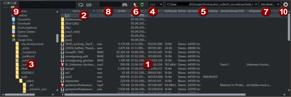 Sequoia enthält einen Dateimanager, mit dem Dateien vorgehört und direkt in Projekte geladen werden können. Der Dateimanager erlaubt Ihnen das Anlegen von Favoriten-Ordnern und den Zugriff auf die zuletzt geöffneten Ordner.