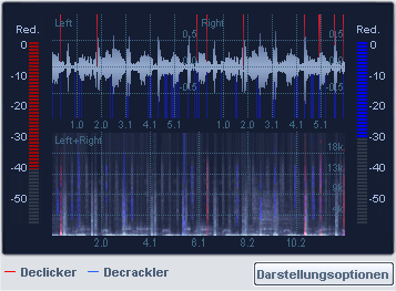 In der Grafik wird das bearbeitete Audiomaterial fortlaufend als Wellenform und als Spektrogramm dargestellt und Sie sehen, an welchen Stellen der DeClicker (rot) oder der DeCrackler (blau) aktiv werden.