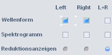 Darstellungsoptionen: Über diese Schaltfläche gelangen Sie zu einem Einstellungsdialog, mit dem Sie die Signaldarstellung konfigurieren können. Wählen Sie den rechten und linken Kanal oder den Mittelwert von links und rechts (L+R) als Quelle für die Wellenform, das Spektrogramm oder die beiden Reduktionsanzeigen. Die Einstellungen werden durch Schließen des Dialogs übernommen.