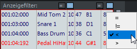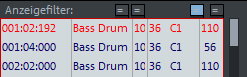Wählen Sie ein Event aus, das eine bestimmte Eigenschaft hat, zum Beispiel eine bestimmte Tonhöhe und klicken Sie auf die Schaltfläche über der entsprechenden Spalte. Dann werden in der Liste nur noch Events mit der selben Eigenschaft (im Beispiel Tonhöhe 36 = Bass Drum) angezeigt. Anzeigefilter können kombiniert werden. So können Sie z. B. alle Control Change Events vom Typ 10 (Lautstärke) auf MIDI-Kanal 6 auswählen.