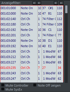 Anzeigefilter: Für den Eventtyp, den Kanal und die zwei Parameterbytes gibt es oberhalb der Spalten der Liste Anzeigefilter. Damit lässt sich die Anzeige der Liste nach Kriterien filtern: |