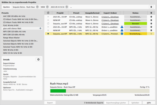 Mit der Export-Liste lassen sich mehrere Projekte nacheinander unter Nutzung verschiedener Export-Presets nacheinander exportieren. So können Sie beispielsweise verschiedene Versionen eines Projekts