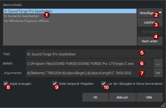 Hinzufügen: Klicken Sie hier, um einen neuen Listeneintrag anzulegen. Es öffnet sich ein Dateiauswahldialog, in dem Sie die ausführbare Datei im Programm-Ordner auswählen können. Wenn SOUND FORGE oder SpectraLayers installiert sind, können Sie über das Menü neben der Schaltfläche gleich passende Einträge mit allen richtigen Argumenten für diese Programme erzeugen. Der Eintrag Im Windows Explorer öffnen öffnet ein Explorerfenster am Speicherort der Audiodatei des Objekts und wählt diese aus. |