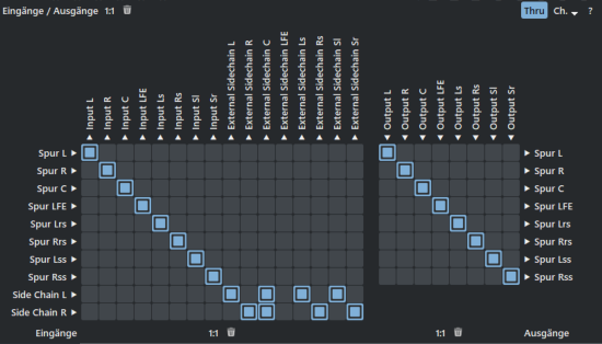 Die linke Matrix erlaubt das Routen des Spursignals (Zeilen) und der Sidechain-Eingänge auf die Plug-in-Eingänge (Spalten). Mit der rechten Matrix routen Sie die Plug-in-Ausgänge (Spalten) zurück auf die Spurkanäle (Zeilen). Die Sidechain-Eingangskanäle werden nur angezeigt, wenn Sidechaining im Plugin verfügbar und aktiviert ist, d.h. ein Spursignal in den Sidechain-Eingang geroutet ist.