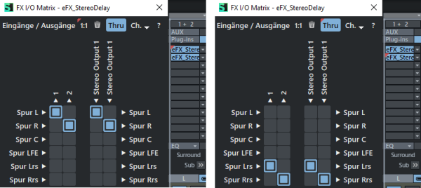 Thru: Mit der Thru Schaltfläche wird das Signal aller Spurkanäle, die nicht auf Plug-in-Eingänge geroutet sind, unverändert in die Effektkette zurück gesendet. Damit können Sie in Surround Bussen oder Mastern mehrere Stereo Plug-ins benutzen, die Sie in verschiedene Plug-in-Slots geladen haben.