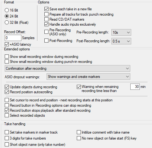 • Pre-Recording (nur ASIO und Wave Format): Wenn aktiv, fügen Sie mit dieser Funktion Audiomaterial, das vor dem Start der Aufnahme am Eingang anlag, zum Anfang der aktuellen Aufnahme hinzu, wenn Sie aus dem Stopp-Zustand oder aus der Wiedergabe heraus die Aufnahme aktivieren. Voreingestellt sind 5 Sekunden, es sind aber bis zu 120 Sekunden möglich. Verschieben Sie den Objektstart der aufgenommenen Objekte nach links, um dieses Material sichtbar zu machen.