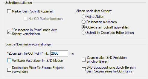 Den Einstellungsdialog für den Source-Destination-Schnitt erreichen Sie über das Menü Bearbeiten > 4-Punkt-Schnitt > Source-Destination-Schnitt-Einstellungen oder über den Systemeinstellungsdialog > SD-Schnitt/MuSyC.