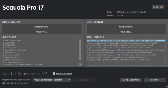 Auf der linken Seite sind Optionen, ein neues Wave- oder Mehrspurprojekt zu erstellen. Für letzteres kann direkt auf die Projektvorlagen aus dem Dialog Neues Virtuelles Projekt zugegriffen werden.