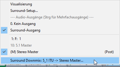 Um den Downmix-Dialog zu öffnen, in dem Sie die Downmix-Koeffizienten einstellen können, wählen Sie im Ausgangsmenü ganz unten den entsprechenden Eintrag