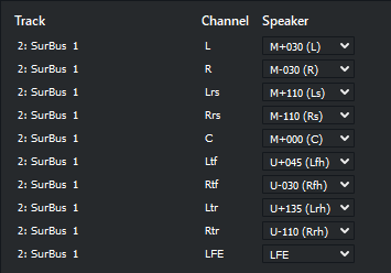 Example: R (right front) = middle level, azimuth -30° = M-30, LTR (Left top rear surround) = Upper level, azimuth +135° = U+135.