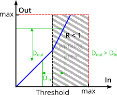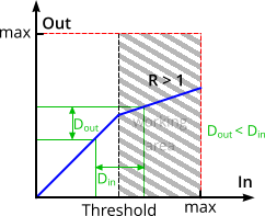 If a stage works as a compressor, it means that the gain above the threshold is reduced: For example, with a set ratio of 2, this means that if the input level is increased by 3 dB, the output level will only be increased by 1.5 dB. High levels (above the threshold) are therefore amplified less than low levels, reducing the dynamic range and compressing the signal. The larger the ratio value, the stronger the compression.