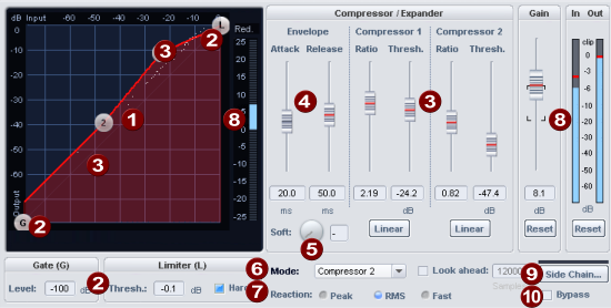 The control points G and L of the characteristic curve control the upper and lower limit of the characteristic curve , the Gate and the Limiter. Below the characteristic curve are the associated parameters.