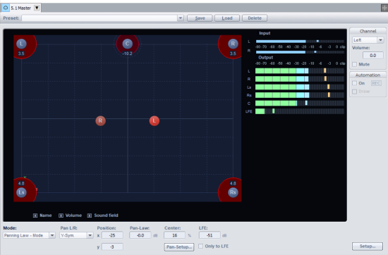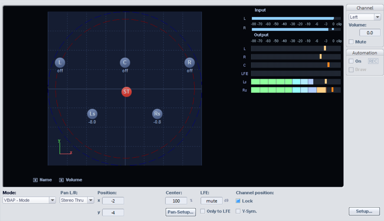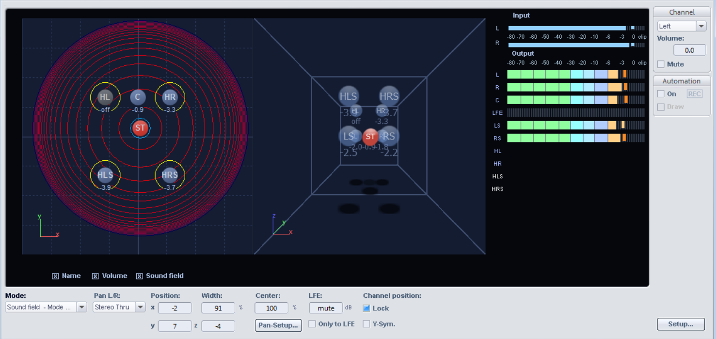 The positions of the speakers are shown at the outer edges of the usable panorama. By clicking the "Sound field" option, you can visually display the graphical levels displayed across the Surround channels. The level distribution between two neighboring loudspeakers follows the -3 dB law, which means that a sound source directly in the middle of two neighboring loudspeakers will be emitted at a level of -3 dB.