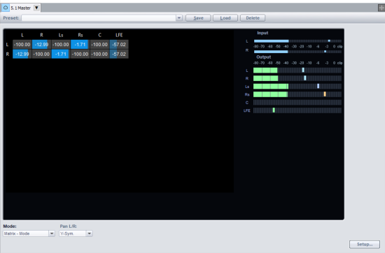 In Matrix Mode you can directly enter the level that will go from the input signal to the individual Surround channels.