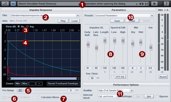 Performance/Options: Room simulation by convolution is relatively computationally expensive. With the settings at Performance Options you can set different qualities for the effect with different levels of computing effort.
