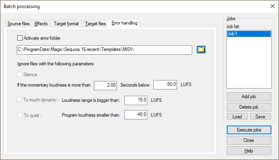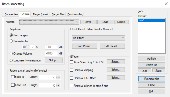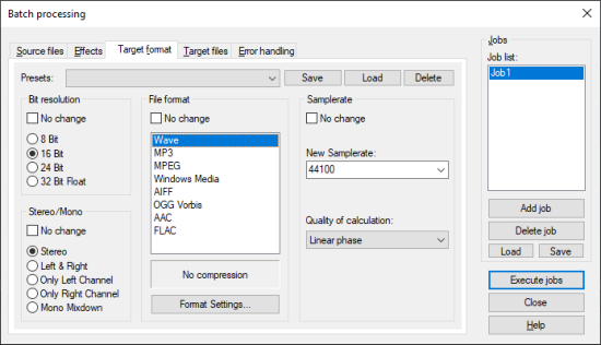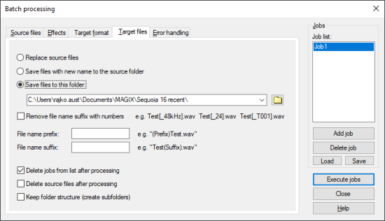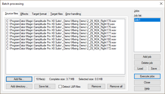 New jobs are created by clicking the Add job button. When you click a job, the settings of this job (source files, effects, destination format, destination files) are displayed in the dialog. Run Jobs starts batch processing and runs all loaded jobs. Delete job removes the selected job.