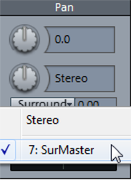Select a surround bus or master from the menu to route the object to the appropriate bus or master. Hold down the "Ctrl" key while selecting in the object editor to route the object to multiple busses at the same time and thus combine different surround pannings. An additional slider appears in the object editor which can be used to adjust the object's send level to the Surround Bus or Master.