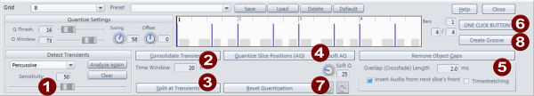 The ONE CLICK BUTTON automatically executes the Detect transients, Consolidate transients, Split at transients, Quantize slice positions (AQ), and Remove Object Gaps commands in one go.
