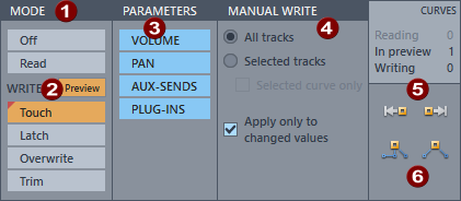 MODE: These buttons allow you to switch automation modes for all tracks together. Regardless of this, it is still possible to select a different automation mode for individual tracks, for example, so as not to accidentally overwrite them. In this case, several buttons are active and the number of tracks in the respective mode is displayed on the button.