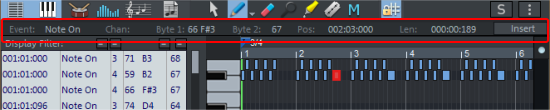 Insert: Inserts a MIDI event with the properties set in the edit fields. Normal MIDI events like notes or CC events are easier to create directly in the editor, you only need this button for creating special MIDI events (see below).